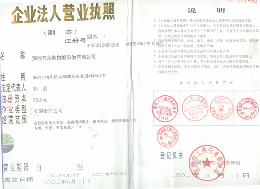 深圳市永泰白蚁防治有限公司(成立于2002年)是具有施工承建资格及国家白蚁防治一级企业资质、由深圳市工商行政管理局注册,由深圳市爱国卫生运动委员会审批的独立法人企业,公司由多名专家组成,副董事长、总工程师陈振耀先生现担任中国物业管理协会成员及白蚁防治专业委员会委员、中山大学动物学专家,高级教授。